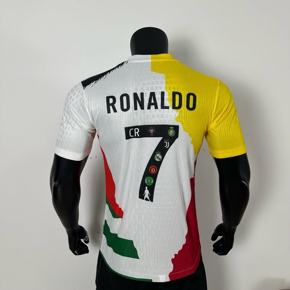 هذا التيشيرت الفريد يجمع شعارات الأندية التي سطّر فيها النجم البرتغالي أعظم لحظاته – من سبورتينغ و مانشستر يونايتد و ريال مدريد و يوفنتوس و النصر السعودي.
